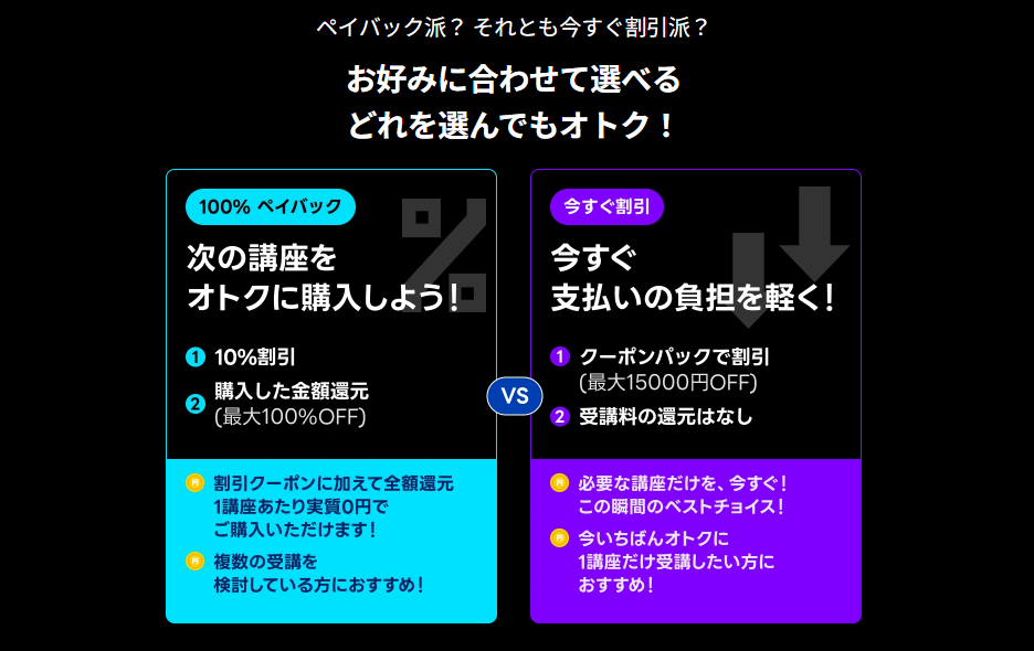 今回のキャンペーンでは、購入後に100%ペイバックを受けるか、最大15,000円OFFのクーポンパックで今すぐ割引を受けるかを選んで講座を購入できます。