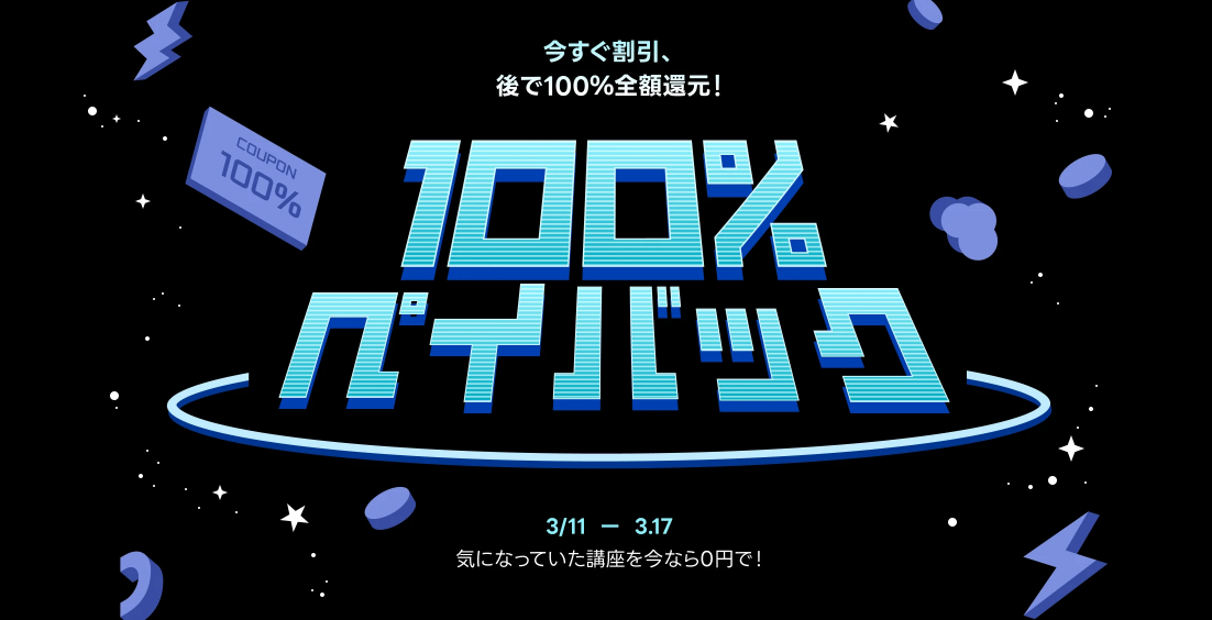 クーポンを使用すると受講価格が安くなります!以下の記事にクーポンの一覧をまとめているので、ぜひお得に購入してください。