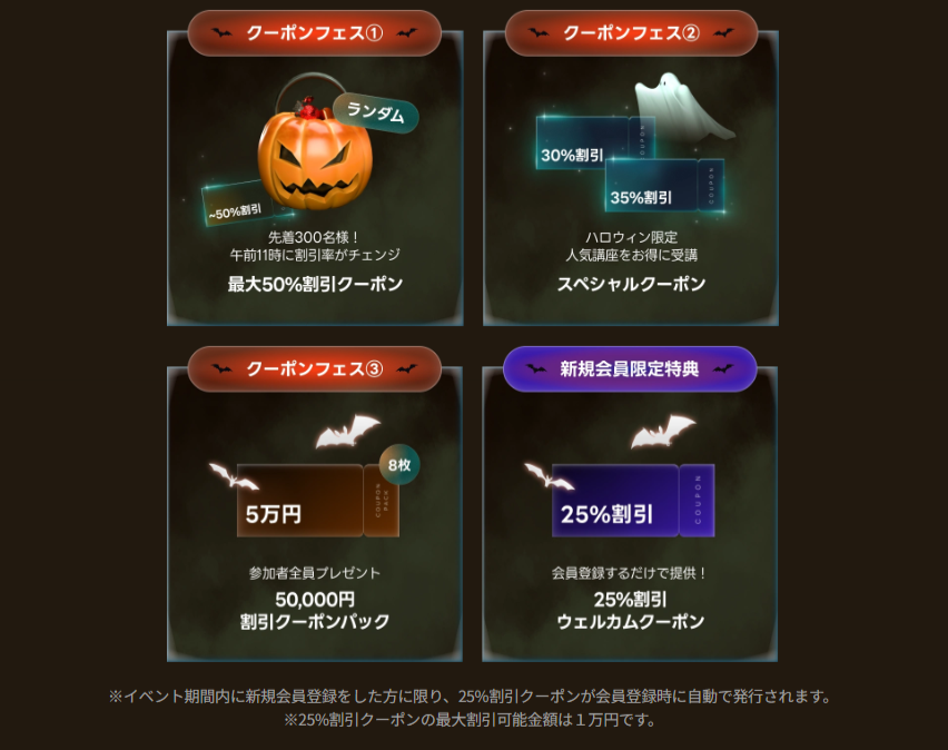 - 全カテゴリーの講座対象の5万円分割引クーポンパック